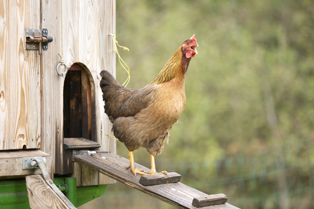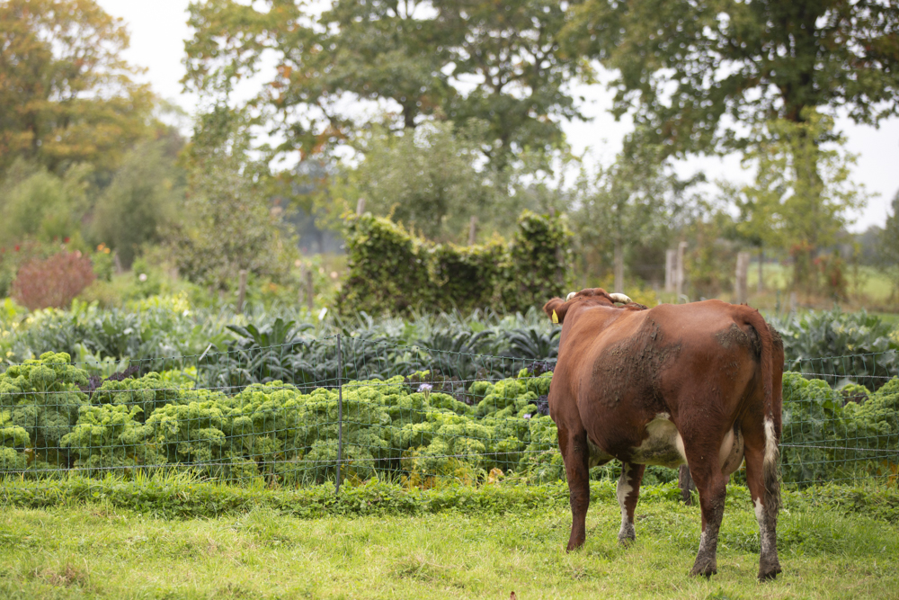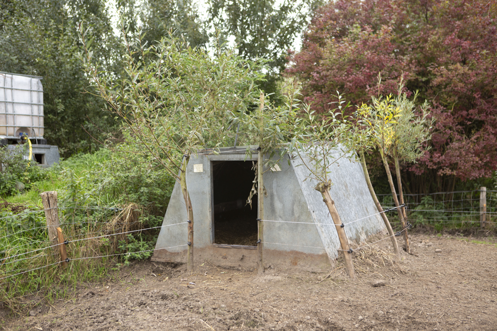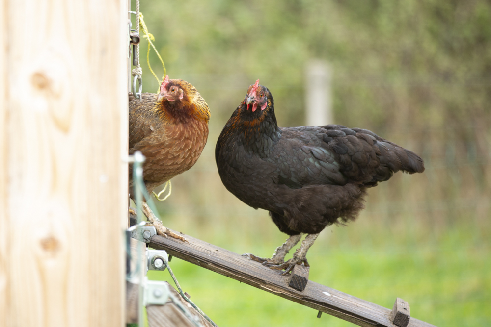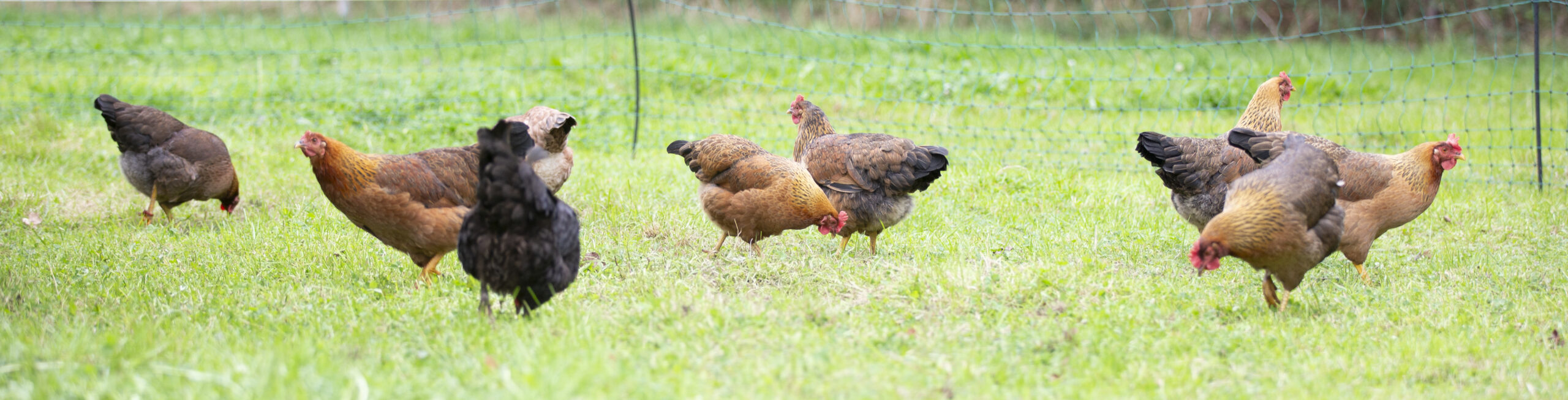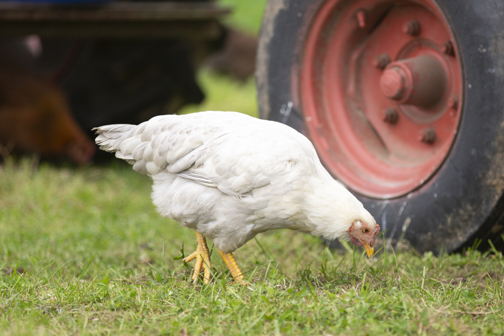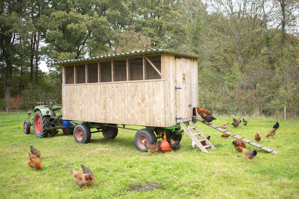 De kippen scharrelen in de weide, ze pikken de insecten die zich verzamelen rondom de mest van de koeien. Elke twee dagen wordt de kippenkar verplaats en krijgen ze een nieuw stuk weide om in te scharrelen. Tegelijkertijd besmeten de kippen de grond waarop ze lopen.